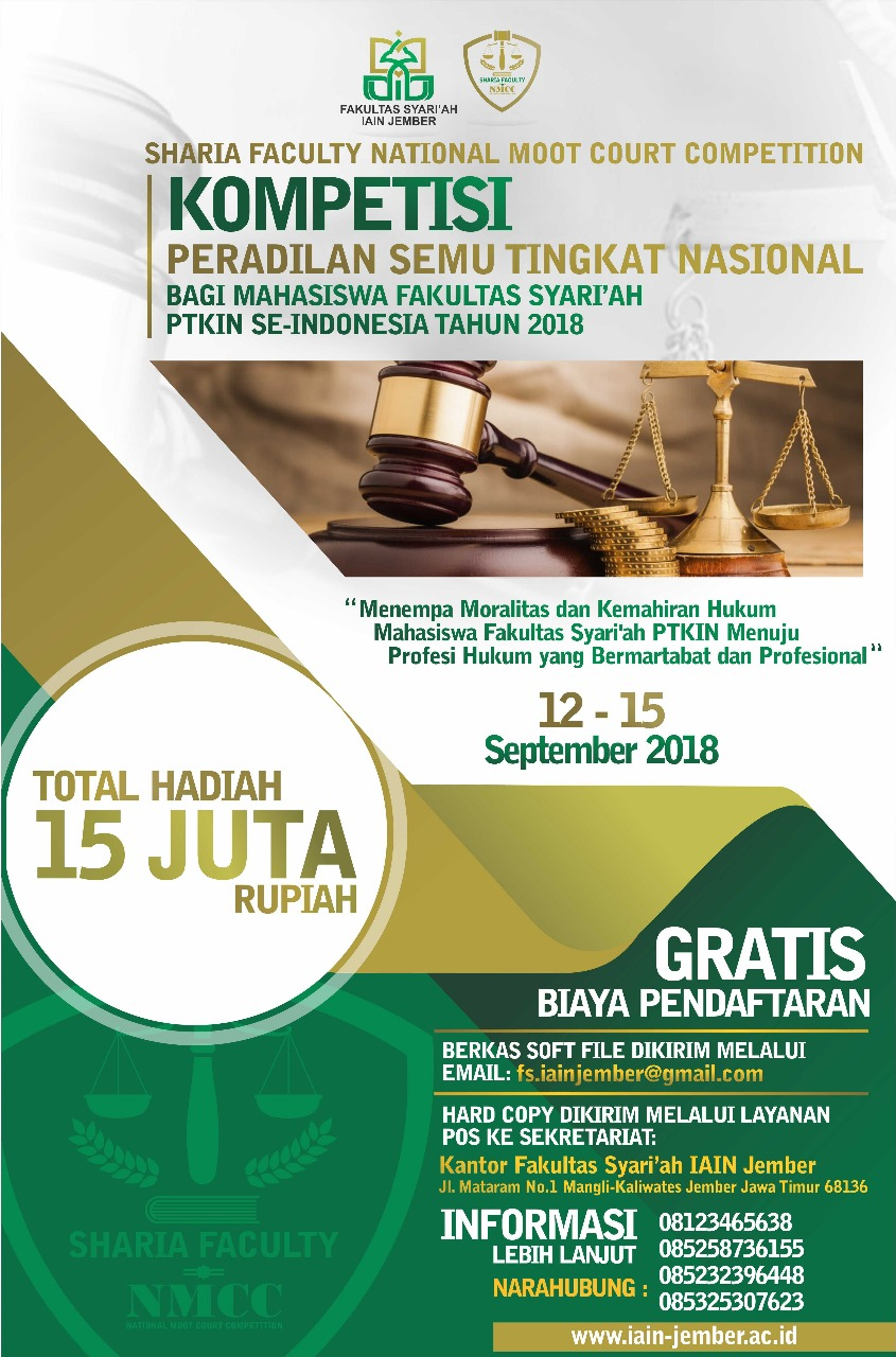 Jember (Humas) – Institut Agama Islam Negeri (IAIN) Jember akan menggelar Kompetisi Peradilan Semu Tingkat Nasional (Sharia Faculty National Moot Court Competition) Tahun 2018. Ajang kompetisi yang dimaksudkan untuk mengasah keilmuan dan keahlian hukum para mahasiswa Fakultas Syariah dari seluruh Perguruan Tinggi Keagamaan Islam Negeri (PTKIN) Indonesia akan digelar tanggal 12 – 15 September 2018 di IAIN Jember.