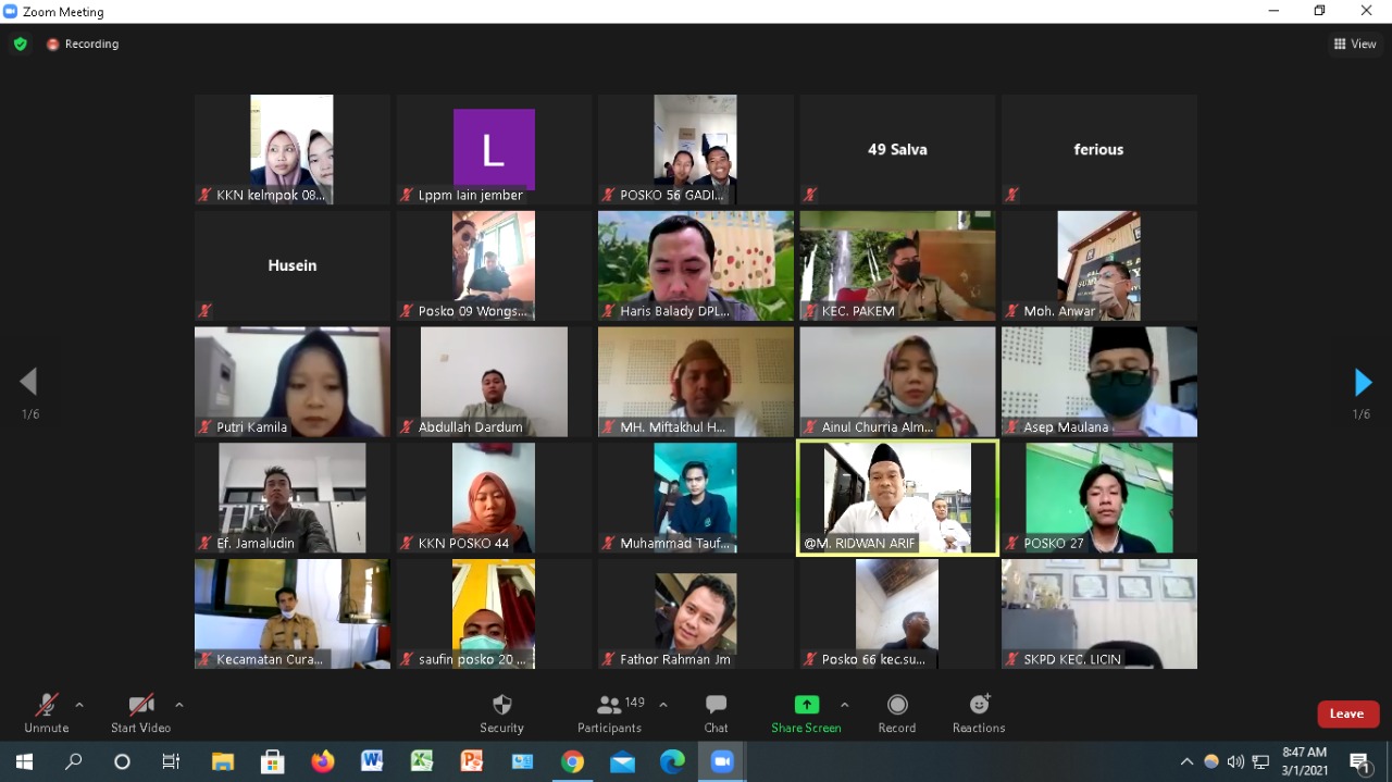 Humas-Kegiatan Mahasiswa KKN tahap I telah selesai dilaksanakan. Kurang lebih selama satu bulan kegiatan KKN berlangsung di lima kabupaten yaitu Jember, Situbondo, Bondowoso, Banyuwangi dan Lumajang. Pada pagi ini (1/3) Lembaga Penelitian dan Pengabdian Masyarakat (LP2M) melaksanakan penarikan serentak mahasiswa KKN tahap I IAIN Jember via daring.