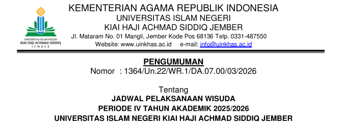 Berikut disampaikan Pengumuman Pelaksanaan Wisuda Periode IV Tahun Akademik 2025/2026: