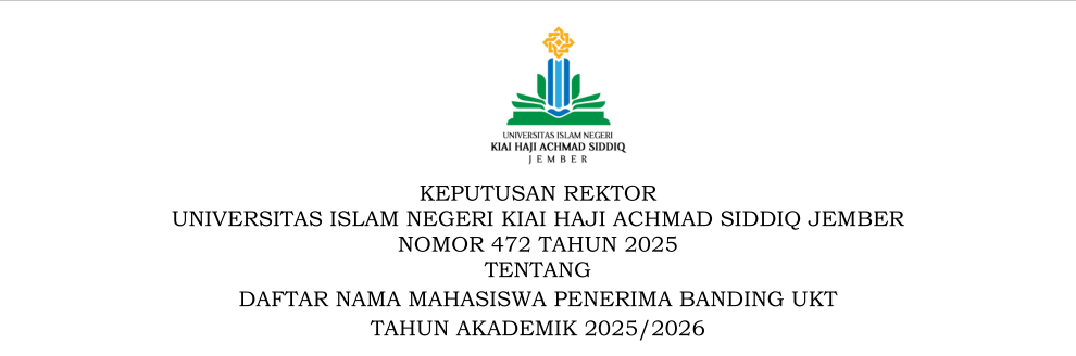 Berikut ini Surat Keputusan Rektor UIN Kiai Haji Achmad Siddiq Jember Nomor 472 Tahun 2025 tentang Daftar Nama Mahasiswa Penerima Banding UKT Tahun Akademik 2025/2026 :