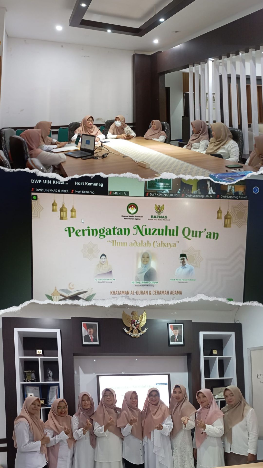 Humas – Ketua Dharma Wanita Persatuan UIN Kiai Haji Achmad Siddiq Jember bersama pengurus dan anggota mengikuti peringatan Nuzulul Qur’an Ramadan 1444 H/ 2023 M yang diadakan oleh Dharma Wanita Persatuan Kementerian Agama RI pada Selasa (11/4).