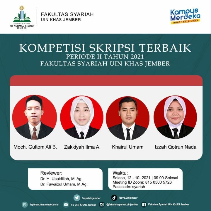 Media Center- Dalam mendukung kreatifitas mahasiswa dalam bidang riset, Fakultas Syariah Universitas Islam Negeri Kiai Haji Achmad Siddiq (UIN KHAS) Jember sukses kembali adakan kompetisi skripsi terbaik antar prodi untuk ke tiga kalinya. Kompetisi tersebut diikuti oleh mahasiswa terpilih yang be...