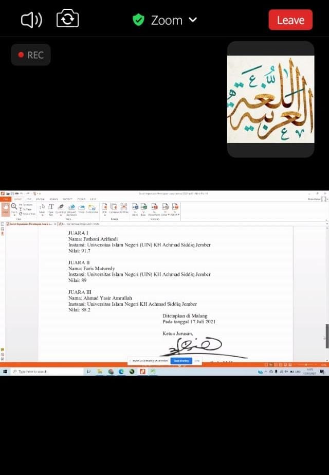 HUMAS- Tiga orang mahasiswa Universitas Islam Negeri Kiai Haji Achmad Siddiq (UIN KHAS) Jember berhasil memborong Juara 1, 2, dan 3 dalam lomba Seminar Nasional Bahasa Arab Mahasiswa (Semnasbama) di Universitas Negeri Malang.