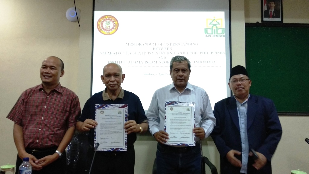 Untuk memperkuat kualitas Sumber Daya Manusia (SDM) Sivitas Akademika, Institut Agama Islam Negeri (IAIN) Jember menandatangani kerjasama dengan Cotabato City State Polytechnic College (CCSPC) Filipina. Penandatangan kerjasama itu dilakukan langsung Rektor IAIN Jember Prof Babun Suharto dengan Pr...