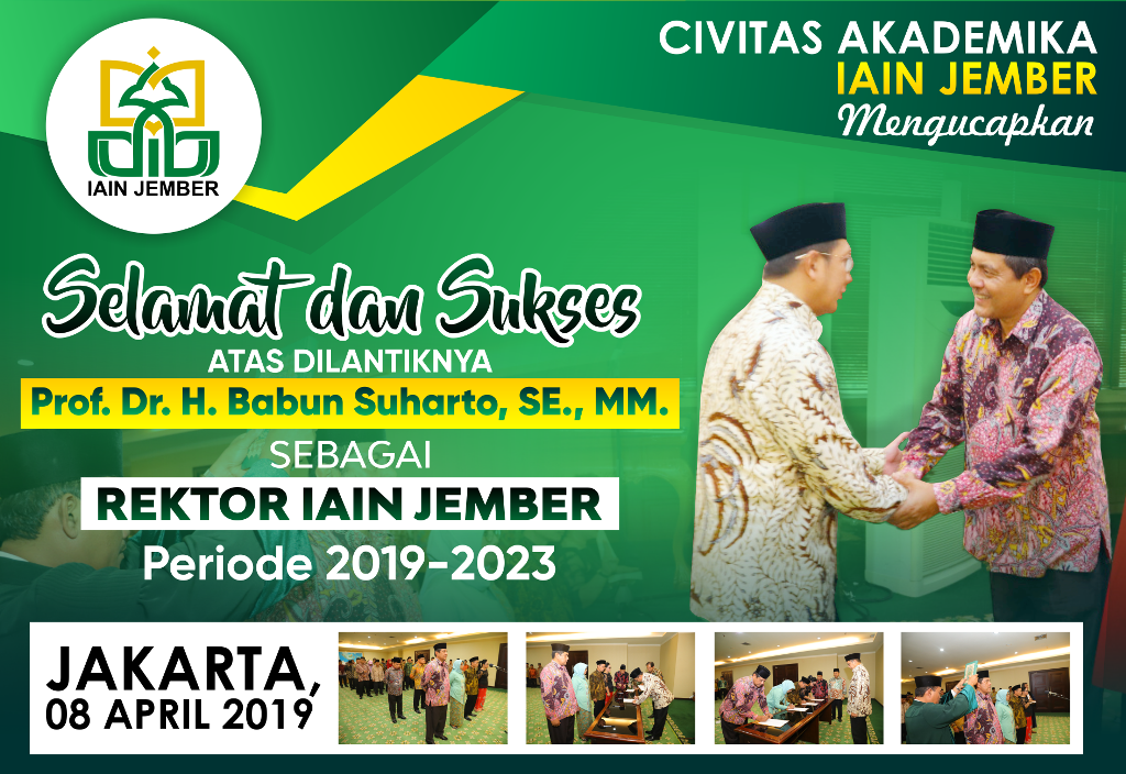 Civitas Akademika Mengucapkan Selamat atas Dilantiknya Prof. Dr. H. Babun Suharto, MM sebagai Rektor IAIN Jember Periode 2019-2023 oleh Menteri Agama, Senin (08/04) di Operation Room Kantor Kementerian Agama, Jalan Lapangan Banteng, Jakarta Pusat.