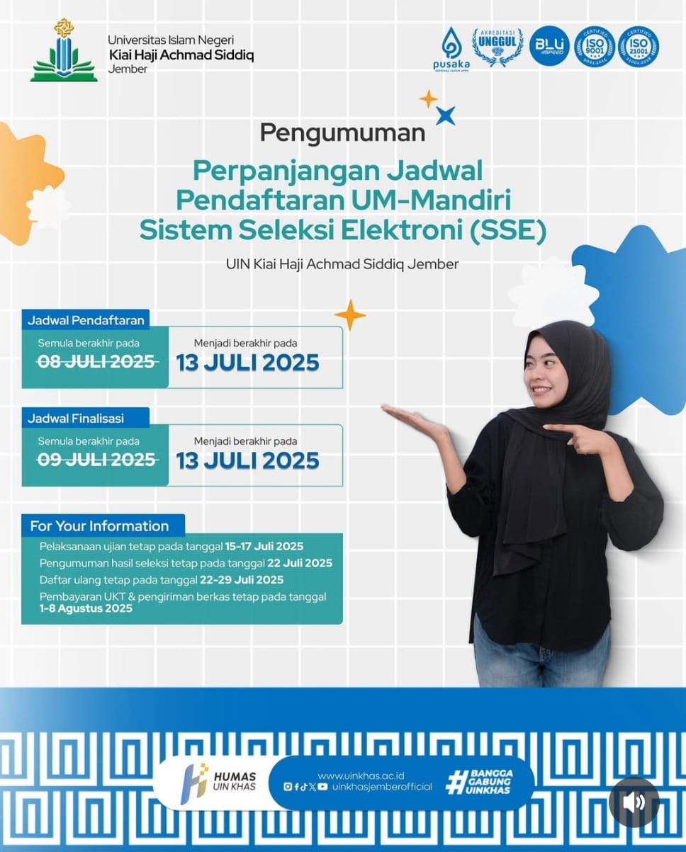 Humas - Kampus Universitas Islam Negeri Kiai Haji Achmad Siddiq (UIN KHAS) Jember saat ini membuka Penerimaan Mahasiswa Baru (PMB) jalur Ujian Mandiri (UM) tahun 2025. Ada perubahan jadwal UM-Mandiri 2025 untuk Seleksi Elektronik (SSE) menggunakan komputer. Pendaftaran berakhir h...