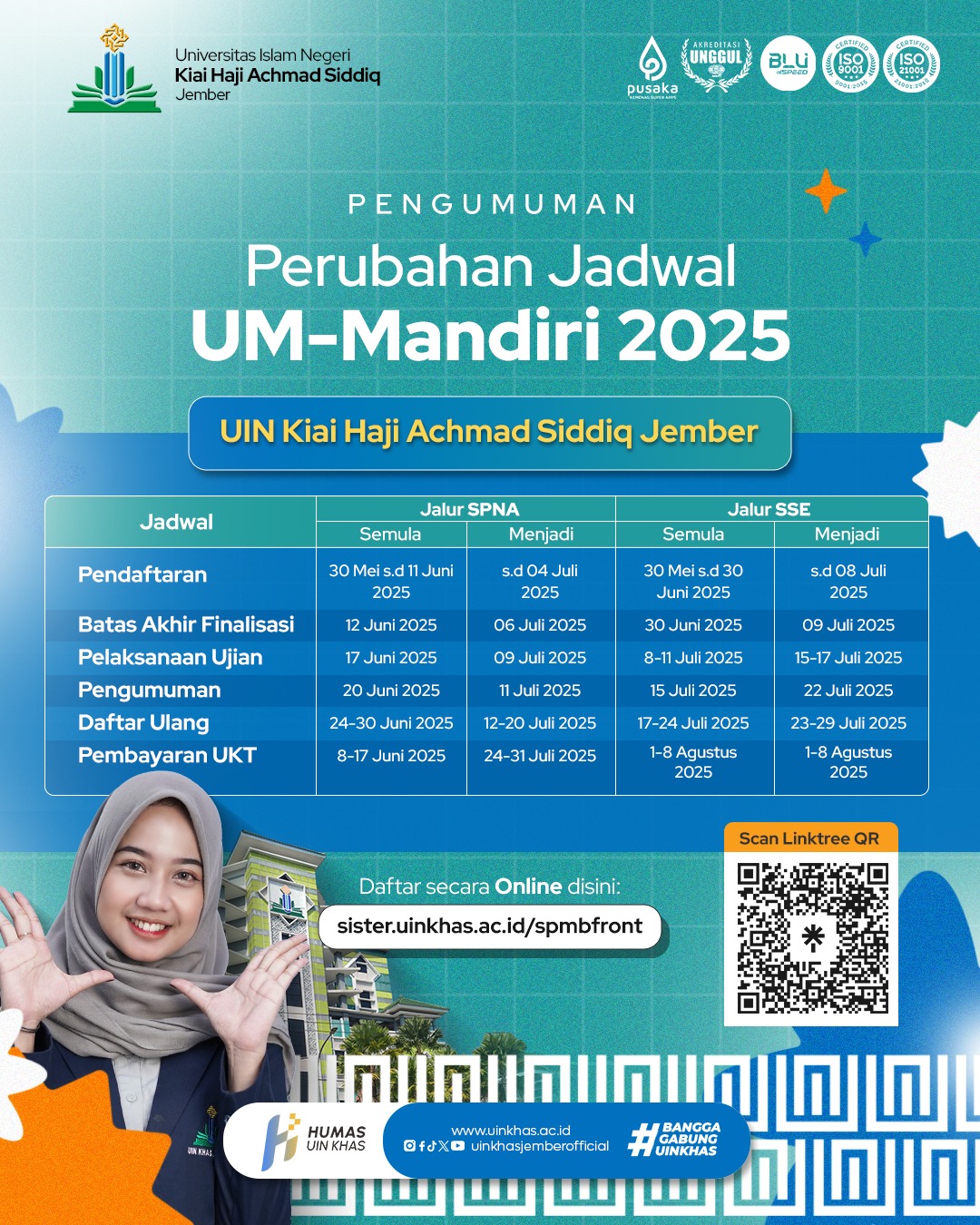 Humas - Universitas Islam Negeri Kiai Haji Achmad Siddiq (UIN KHAS) Jember kembali membuka penerimaan mahasiswa baru untuk tahun 2025 melalui jalur Ujian Mandiri atau UM. Terdapat dua jalur seleksi yang dibuka dalam jalur ini, yaitu Seleksi Prestasi Non Akademik (SPNA) dan jalur...