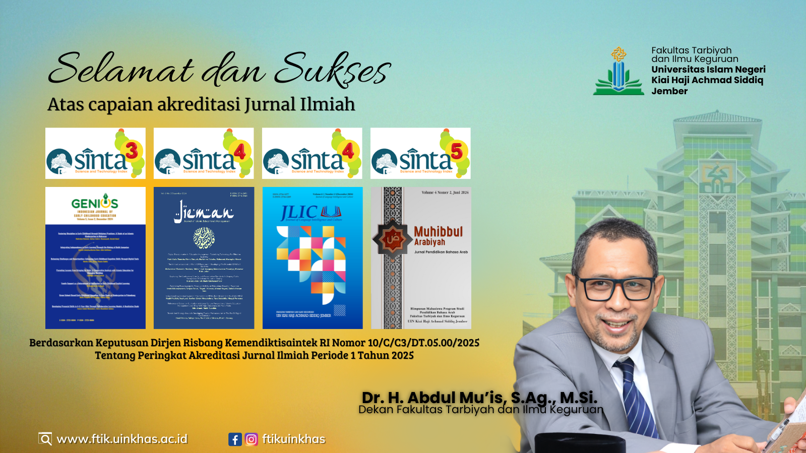 Humas - Fakultas Tarbiyah dan Ilmu Keguruan Universitas Islam Negeri Kiai Haji Achmad Siddiq (FTIK UIN KHAS) Jember menorehkan prestasi membanggakan di bidang publikasi ilmiah. Di awal tahun ini, Jurnal GENIUS: Indonesian Journal of Early Childhood Education berhasil meraih akredita...