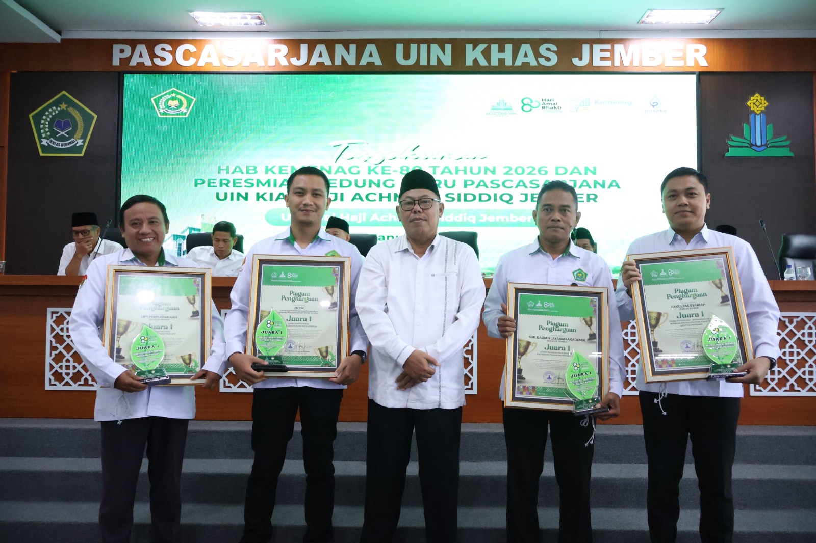 Humas - Rektor UIN Kiai Haji Achmad Siddiq Jember, Prof. Dr. H. Hepni, S.Ag., M.M., CPEM., menyerahkan piagam dan piala kepada para pemenang Lomba Kantor Berbasis Ekoteologi dalam rangkaian Tasyakuran Hari Amal Bakti (HAB) Kementerian Agama Republik Indonesia Tahun 2026 sekaligus...