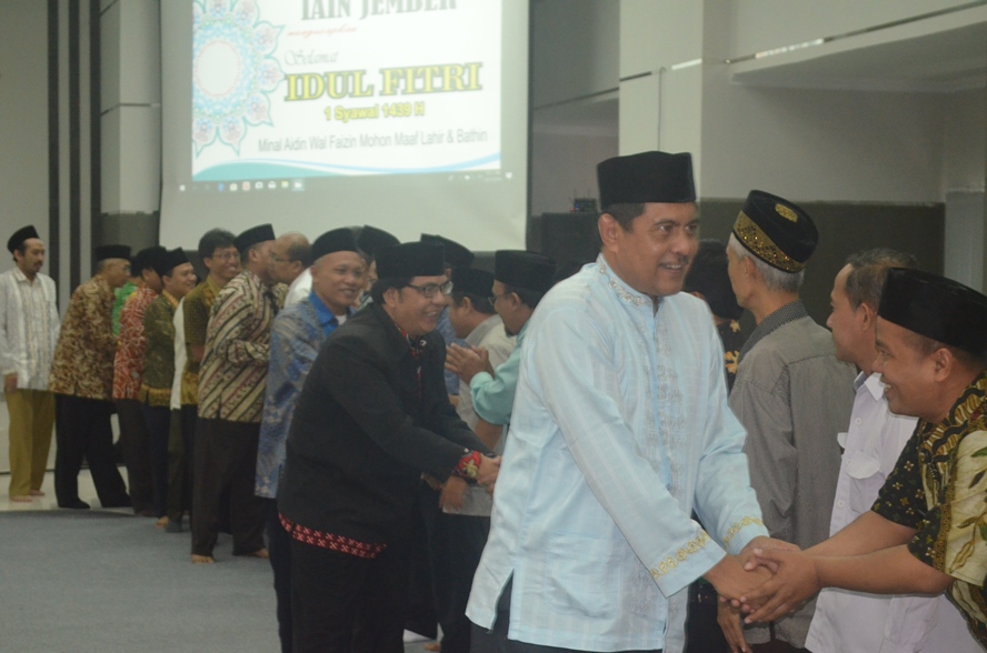 Humas (Jember) – Keluarga besar Institut Agama Islam Negeri (IAIN) Jember menggelar acara Halal Bihalal bersama seluruh pegawai di pertama hari kerja usai libur lebaran. Acara halal bihalal dimulai sejak jam 08.30 WIB di Gedung Kuliah Terpadu (GKT) IAIN Jember.