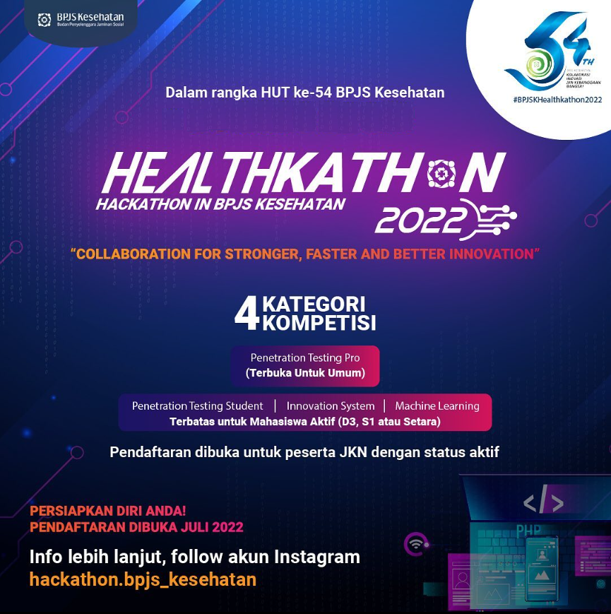 Untuk informasi lebih lanjut terkait kegiatan BPJS Kesehatan Healthkathon Tahun 2022, dapat diakses di website dan media sosial berikut :