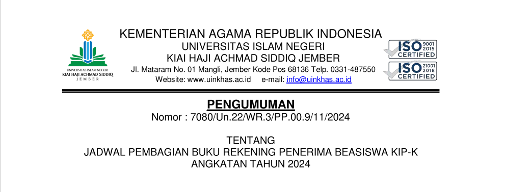 Pengumuman Jadwal Pembagian Buku Rekening Penerima Beasiswa KIP-K Angkatan Tahun 2024 UIN KHAS Jember