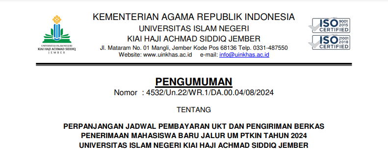 Pengumuman Perpanjangan Jadwal Pembayaran UKT dan pengiriman berkas Calon Mahasiswa Baru Jalur UM PTKIN Tahun 2024 UIN Kiai Haji Achmad Siddiq Jember