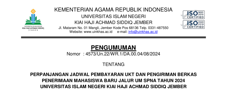 Pengumuman Perpanjangan Jadwal Pembayaran UKT dan pengiriman berkas Calon Mahasiswa Baru Jalur UM SPNA Tahun 2024 UIN Kiai Haji Achmad Siddiq Jember
