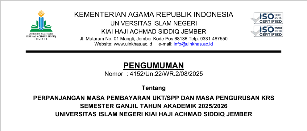 PENGUMUMAN PERPANJANGAN MASA PEMBAYARAN UKT/SPP DAN MASA PEMROGRAMAN MATA KULIAH SEMESTER GANJIL T.A. 2025/2026