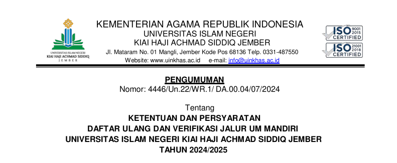Berikut ini ketentuan dan persyaratan Daftar Ulang dan Verifikasi jalur UM Mandiri Universitas Islam Negeri Kiai Haji Achmad Siddiq Jember Tahun 2024/2025: