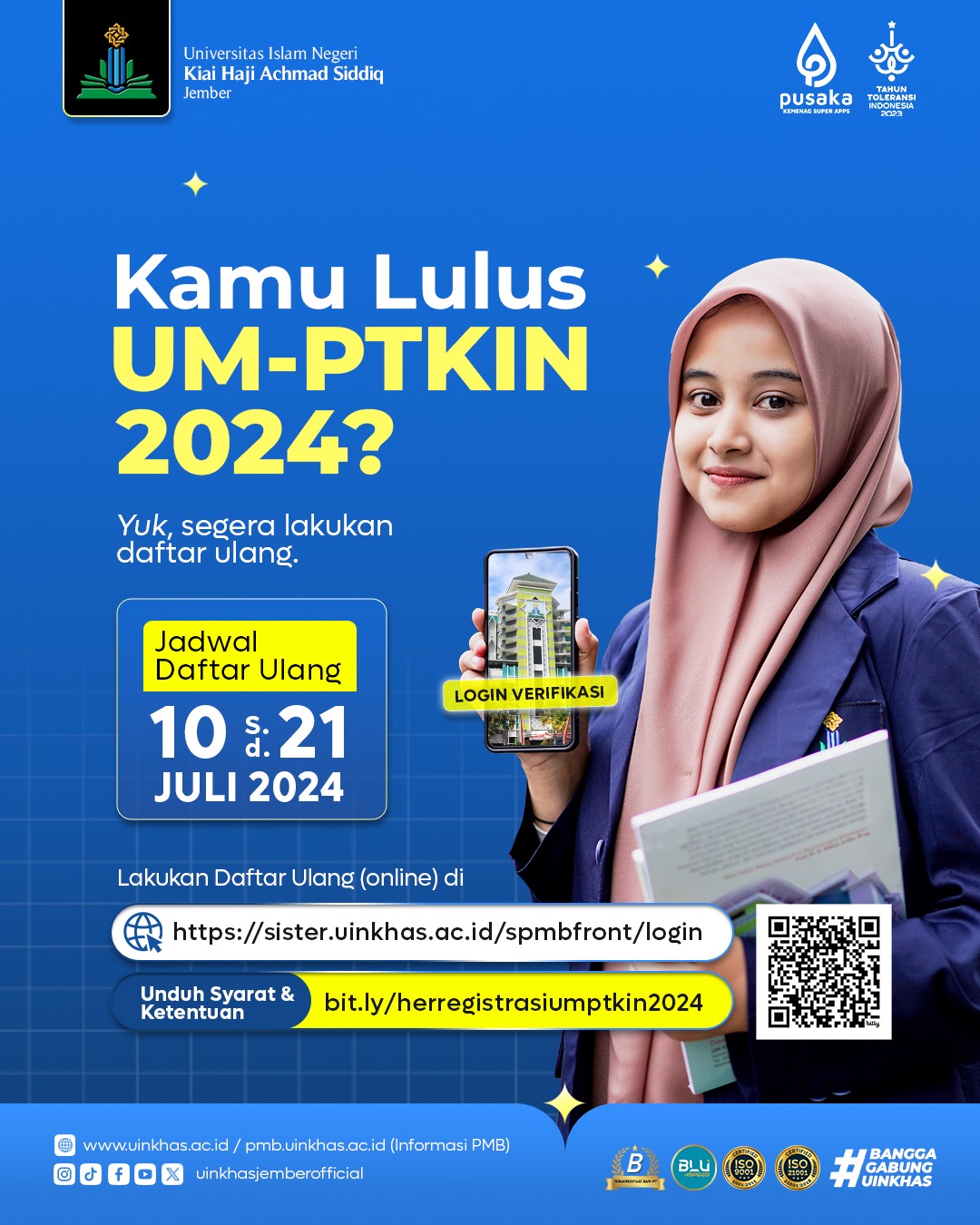 Berikut ini ketentuan dan persyaratan Daftar Ulang dan Verifikasi jalur UM-PTKIN Universitas Islam Negeri Kiai Haji Achmad Siddiq Jember Tahun Akademik 2024/2025:
