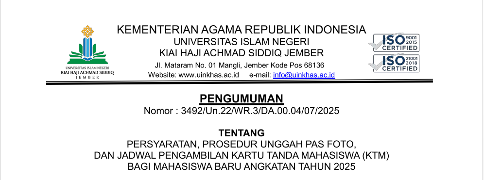 PENGUMUMAN TENTANG PERSYARATAN, PROSEDUR UNGGAH PAS FOTO, DAN JADWAL PENGAMBILAN KARTU TANDA MAHASISWA (KTM) BAGI MAHASISWA BARU ANGKATAN 2025