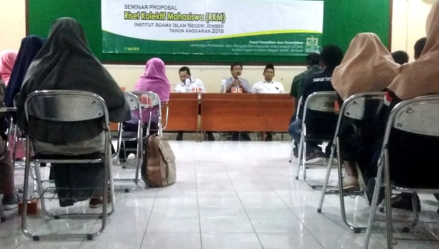 IAIN Jember- Sedikitnya 64 Mahasiswa Institut Agama Islam Negeri (IAIN) Jember yang terbagi dalam 32 Kelompok Tim Penelitian melakukan presentasi dalam seminar proposal penelitian yang digelar oleh Pusat Penelitian dan Penerbitan, Lembaga Penelitian dan Pengabdian kepada Masyarakat (LP2M) IAIN Jember. Selasa (17/04).