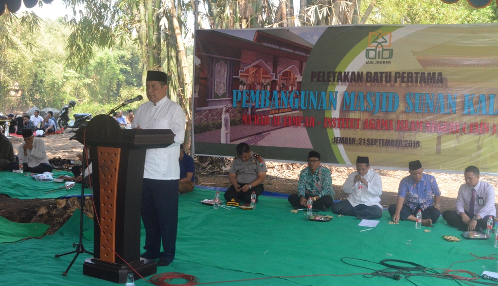 IAIN Jember - Rektor Institut Agama Islam Negeri (IAIN) Jember Babun Suharto meletakkan batu pertama pembangunan masjid Sunan Kalijogo kampus IAIN Jember. Peresmian masjid ini menjadi penanda tahapan awal dimulainya pembangunan masjid yang berada di lingkungan Ma’had Saifudin Zuhri IAIN Jember.