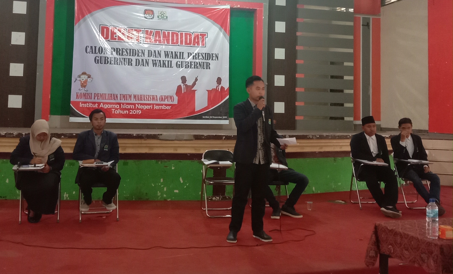 HUMAS - Komisi Pemilihan Umum Mahasiswa (KPUM) Institut Agama Islam Negeri (IAIN) Jember menyelenggarakan debat kandidat Calon Presiden Mahasiswa (Capresma) dan Calon Wakil Presiden Mahasiswa (Cawapresma) atau DEMA-I (Dewan Eksekutif Mahasiswa), Senin (18/06/2019). Debat kandidat yang diikuti oleh tiga calon utama. Masing-masing pasangan Capresma dan cawapresma nomor urut 1 Nuria Fina Maulida dan M. Ulil Albab, pasangan nomor urut 02 Moh. Jufri dan Ach. Dimyati Musrofa; pasangan nomor urut 03 Muhammad Alfarisi dan Moch. Royyan.