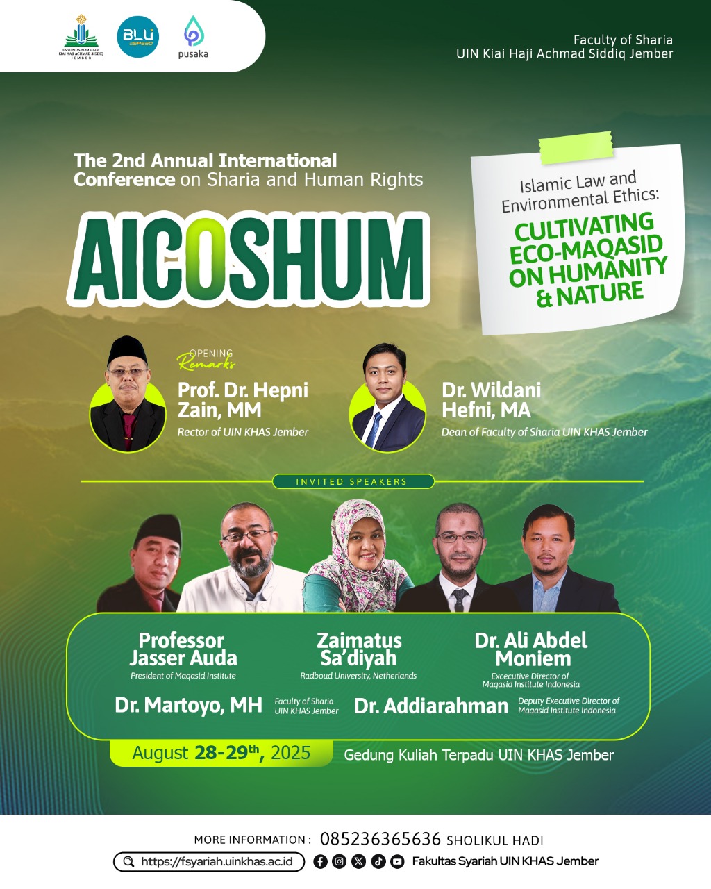 Humas - Fakultas Syariah Universitas Islam Negeri Kiai Haji Achmad Siddiq (UIN KHAS) Jember akan menyelenggarakan kegiatan 2nd Annual International Conference on Sharia and Human Rights (AICOSHUM) tahun 2025 dengan tema Islamic Law and Environmental Ethics: Cultivating Eco-Maqasi...