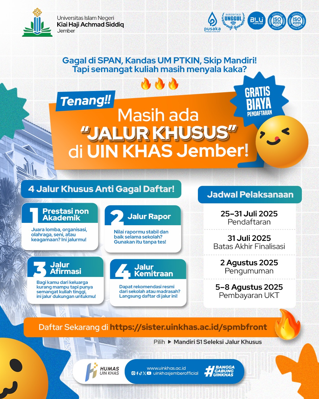 Humas - Kampus Universitas Islam Negeri Kiai Haji Achmad Siddiq (UIN KHAS) Jember saat ini membuka Penerimaan Mahasiswa Baru (PMB) Mandiri dengan empat jalur khusus. Pendaftaran ini dibuka hingga tanggal 31 Juli 2025 dengan skema bebas pendaftaran atau gratis.