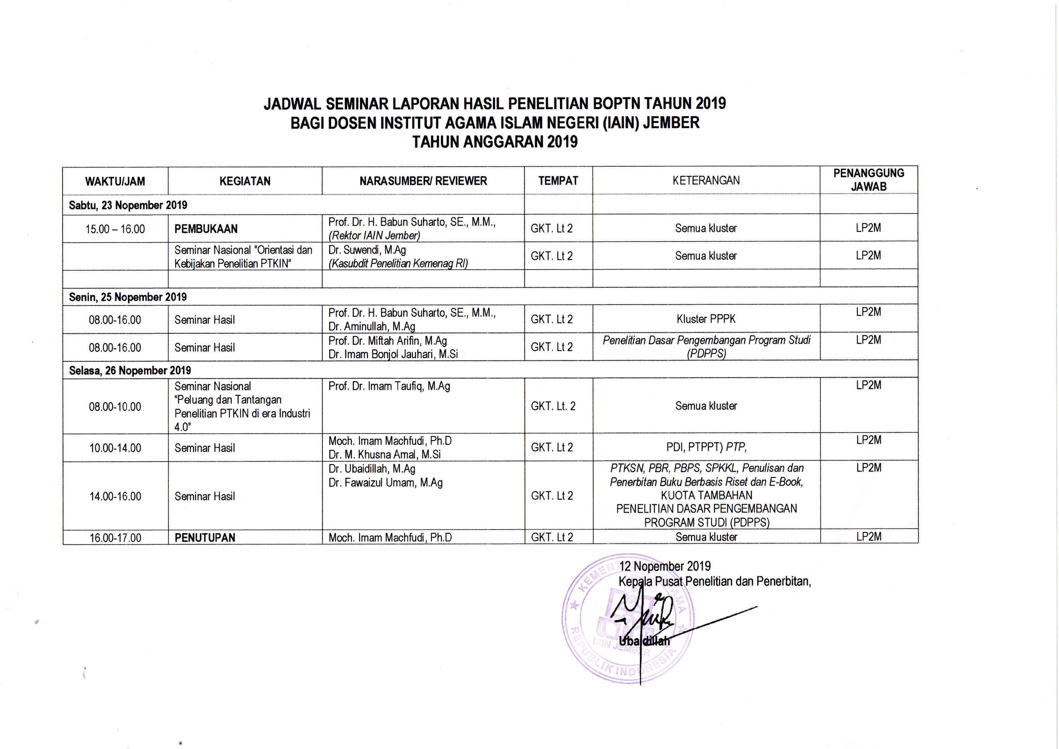 Jadwal Seminar Laporan Hasil Penelitian BOPTN 2019